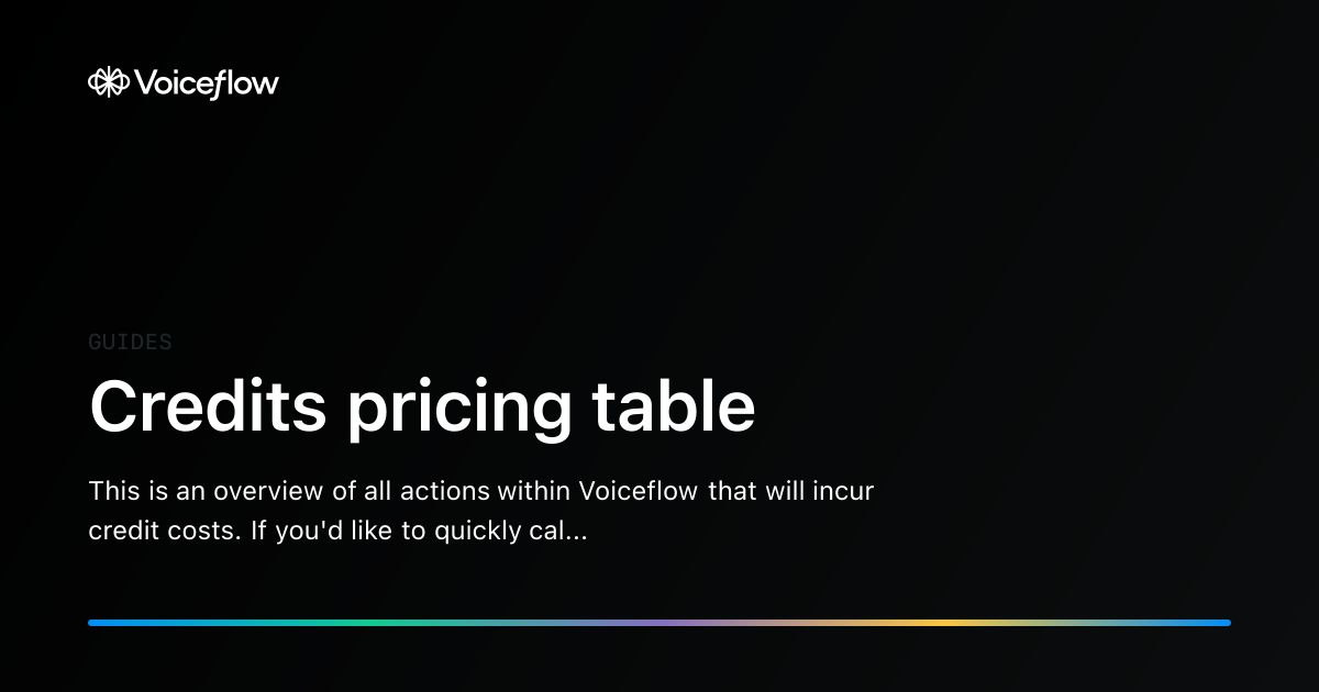 This is an overview of all actions within Voiceflow that will incur credit costs. If you'd like to quickly calculate how many credits your agent is expected to need, we recommend trying our credits estimate calculator.